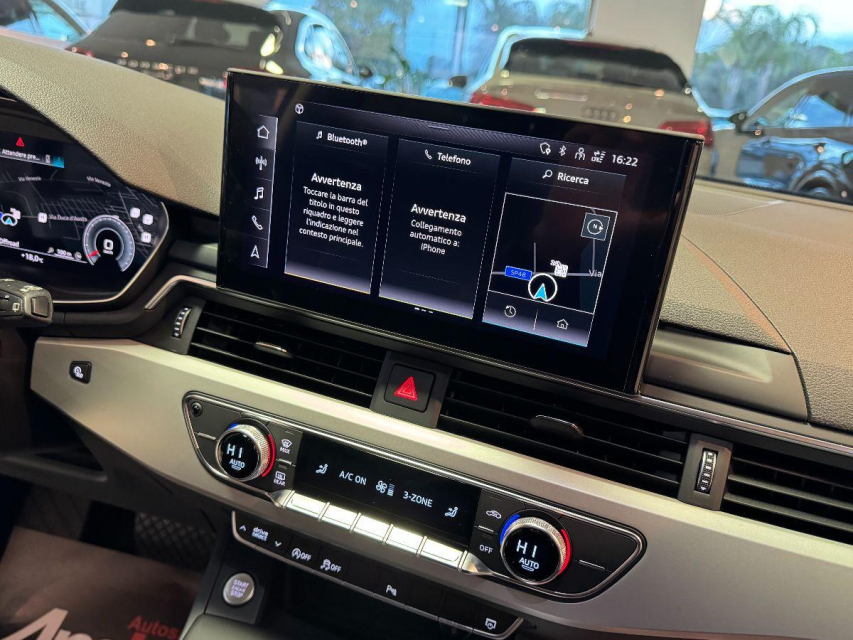 AUDI A4 Avant Elettrica-Diesel in vendita a San Michele Salentino (Brindisi) ABS, Adaptive Cruise Control, Adatta ai neopatentati, Airbag, Airbag Laterale, Airbag Passeggero, Airbag posteriore, Airbag testa, Alzacristalli Elettrici, Android auto, Appoggiabraccia centrale, Autoradio, Autoradio digitale, Avviso di distanza, Bluetooth, Cerchi in Lega, Chiusura Centralizzata, Climatizzatore aut. 3 zone, Comandi al volante, Computer Bordo, Cruise Control, Cruise Control Adattivo, Fari full-LED, Fari LED, Freno di stazionamento elettrico, Idroguida, Immobilizzatore Elettronico, Impianto audio, Lettore CD, Leve al volante, Luci diurne, Luci diurne LED, Navigatore, Parcheggio assistito, Park Distance Control, Partenza assistita su pendenza, Presa USB / AUX, Schermo multifunzione, Sedili sportivi, Sensori di parcheggio posteriori, Sensori Luci, Sensori Pioggia, Servosterzo, Sistema di chiamata d'emergenza, Sistema di controllo pressione pneumatici, Specchietti Elettrici, Start e Stop, Tagliandi certificati, Tetto panoramico, Tettuccio Apribile, Touch, Veicolo non fumatori, Volante in pelle, Volante multifunzione