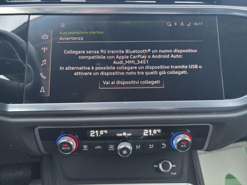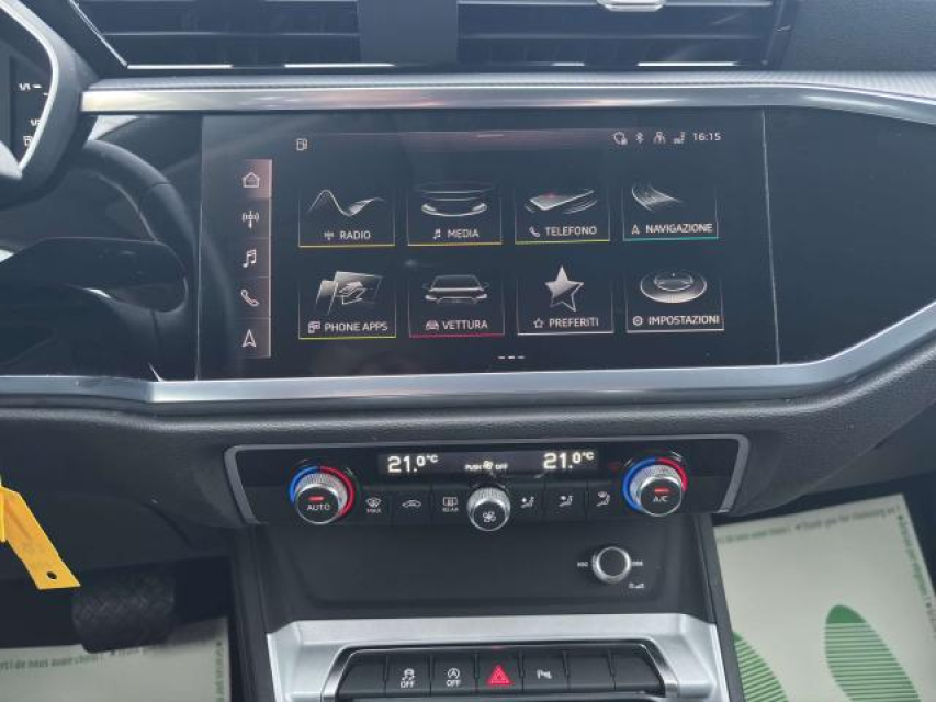 AUDI Q3 Diesel in vendita a San Severo (Foggia) Bracciolo, Climatizzatore bizona, Partenza assistita su pendenza, Sensori Luci, Sensori Pioggia, Sensori di parcheggio anteriori, Sensori di parcheggio posteriori, Navigatore, Specchietti Elettrici, Start e Stop, Volante in pelle, Volante multifunzione, Android auto, Apple car play, Autoradio, Autoradio digitale, Bluetooth, Computer Bordo, Hotspot Wi-Fi, Lettore CD MP3, Schermo multifunzione, Impianto audio, Presa USB / AUX, Kit vivavoce, Cerchi in Lega, Comandi vocali, Filtro antiparticolato, Freno di stazionamento elettrico, Luce d'ambiente, Pneumatici estivi, Portapacchi, Specchietto retrovisore con funzione antiabbagliamento, Spoiler, Touch, ABS, Adaptive Cruise Control, Airbag, Airbag Laterale, Airbag Passeggero, Airbag posteriore, Airbag testa, Antifurto, Chiusura Centralizzata, Chiusura centralizzata telecomandata, Controllo Trazione (TSC - ASR), Lane assist (controllo corsia), ESP (Controllo stabilita), Fari LED, Fari di profondita antiabbagliamento, Fari full-LED, Frenata di emergenza assistita, Immobilizzatore Elettronico, Isofix, Limitatore di velocita, Luci diurne LED, Servosterzo, Sistema di chiamata d'emergenza, Sistema di controllo pressione pneumatici, Sistema di riconoscimento della stanchezza, Tagliandi certificati, Filtro antiparticolato