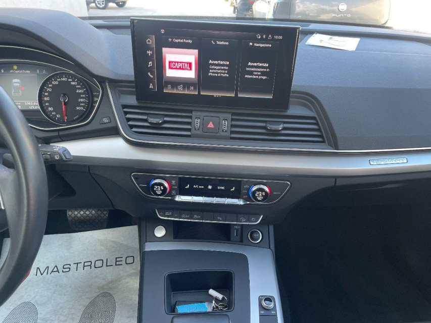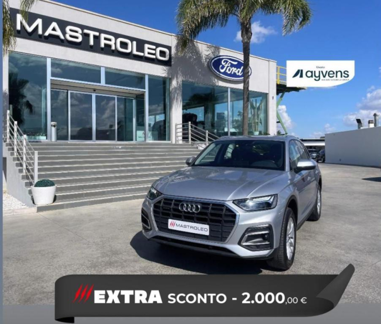 AUDI Q5 Elettrica-Diesel in vendita a Lucugnano (Lecce) ABS, Airbag, Airbag Laterale, Airbag Passeggero, Airbag posteriore, Airbag testa, Alzacristalli Elettrici, Android auto, Apple car play, Appoggiabraccia centrale, Appoggiatesta posteriore, Autoradio, Bluetooth, Bracciolo, Cambio al volante, Cerchi in Lega, Chiusura Centralizzata, Chiusura centralizzata telecomandata, Climatizzatore Automatico, Comandi al volante, Comandi vocali, Computer Bordo, Fari di profondita antiabbagliamento, Fari LED, Frenata di emergenza assistita, Freno di stazionamento elettrico, Indicatore temperatura esterna, Isofix, Lettore CD MP3, Leve al volante, Limitatore di velocita, Luce d'ambiente, Luci diurne, Luci diurne LED, Navigatore, Presa USB / AUX, Schermo multifunzione, Sedili posteriori sdoppiabili, Sensori di parcheggio anteriori, Sensori di parcheggio posteriori, Sensori Luci, Sensori Pioggia, Servosterzo, Sistema di controllo pressione pneumatici, Start e Stop, Sterzo regolabile in altezza, Tagliandi certificati, Veicolo non fumatori, Vetri Oscurati, Volante in pelle, Volante multifunzione