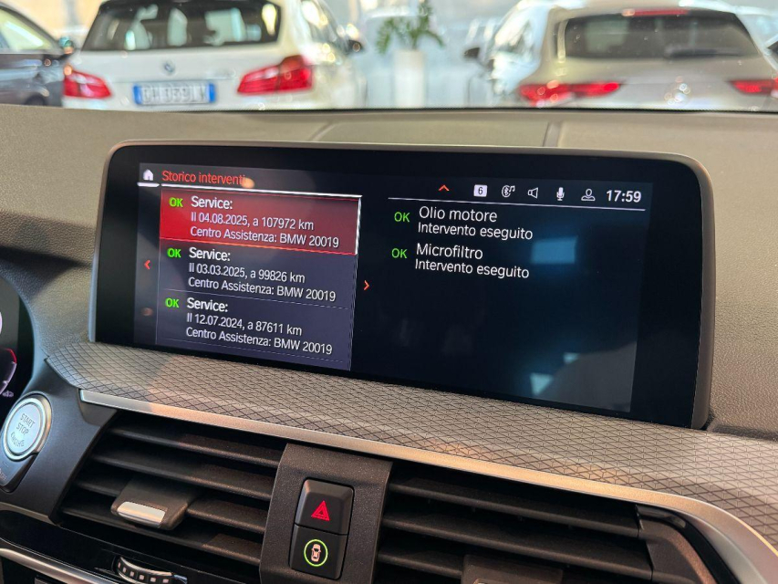 BMW X3 Diesel in vendita a San Michele Salentino (Brindisi) 360 camera, ABS, Adaptive Cruise Control, Airbag, Airbag Laterale, Airbag Passeggero, Airbag posteriore, Airbag testa, Alzacristalli Elettrici, Android auto, Apple car play, Appoggiabraccia centrale, Autoradio, Autoradio digitale, Avviso di distanza, Bluetooth, Bracciolo, Cambio al volante, Carica smartphone a induzione, Cerchi in Lega, Chiave con transponder, Climatizzatore aut. 3 zone, Comandi al volante, Computer Bordo, Controllo Trazione (TSC - ASR), Correttore assetto fari, Cruise Control, Cruise Control Adattivo, ESP (Controllo stabilita), Fari di profondita antiabbagliamento, Fari full-LED, Fari LED, Frenata di emergenza assistita, Freno di stazionamento elettrico, Hotspot Wi-Fi, Idroguida, Immobilizzatore Elettronico, Impianto audio, Indicatore temperatura esterna, Interni Pelle, Lane assist (controllo corsia), Leve al volante, Limitatore di velocita, Luce d'ambiente, Luci diurne, Luci diurne LED, Navigatore, Paraurti in tinta, Parcheggio assistito, Park Distance Control, Partenza assistita su pendenza, Portellone posteriore elettrico, Presa USB / AUX, Regolazione Sedili Elettrica, Riconoscimento segnali stradali, Schermo multifunzione, Sedile guida regolabile in altezza, Sedili posteriori sdoppiabili, Sedili Riscaldati, Sedili sportivi, Sensori di parcheggio anteriori, Sensori di parcheggio posteriori, Sensori Luci, Sensori Pioggia, Sistema di chiamata d'emergenza, Sistema di controllo pressione pneumatici, Sistema di riconoscimento della stanchezza, Sistema elettronico della stab, Specchietti Elettrici, Start e Stop, Sterzo regolabile in altezza, Supporto lombare, Tagliandi certificati, Telecamera Posteriore, Tendine parasole, Tetto panoramico, Tettuccio Apribile, Touch, Trazione Integrale, Veicolo non fumatori, Vetri Oscurati, Volante in pelle, Volante multifunzione