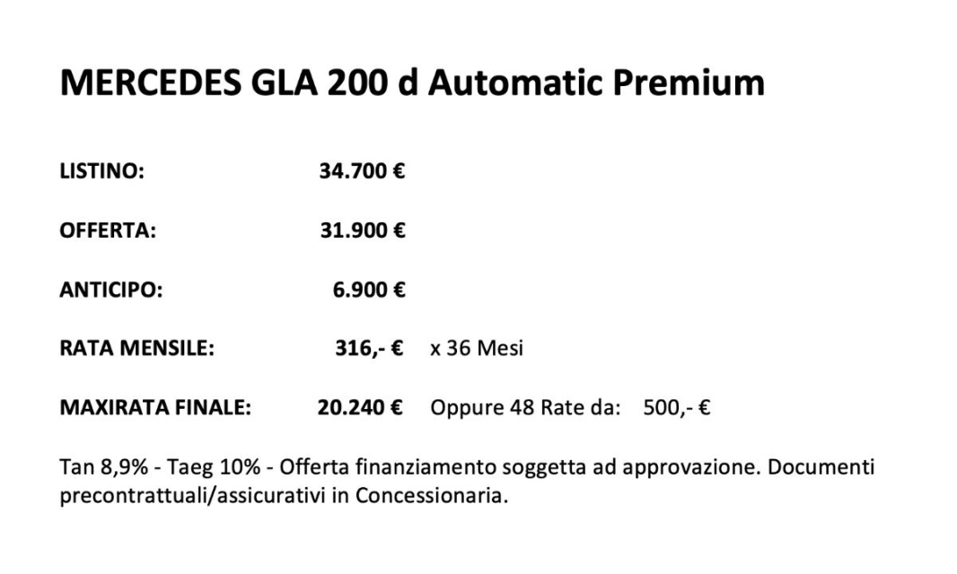 MERCEDES Classe GLA Diesel in vendita a Melissano (Lecce) ABS, Airbag, Airbag Laterale, Airbag Passeggero, Alzacristalli Elettrici, Appoggiabraccia centrale, Appoggiatesta posteriore, Autoradio, Bluetooth, Chiave con transponder, Chiusura Centralizzata, Controllo Trazione (TSC - ASR), Correttore assetto fari, ESP (Controllo stabilita), Immobilizzatore Elettronico, Indicatore temperatura esterna, Riconoscimento segnali stradali, Sedile guida regolabile in altezza, Sedili posteriori sdoppiabili, Sensori Pioggia, Specchietti Elettrici, Sterzo regolabile in altezza, Telecamera Posteriore